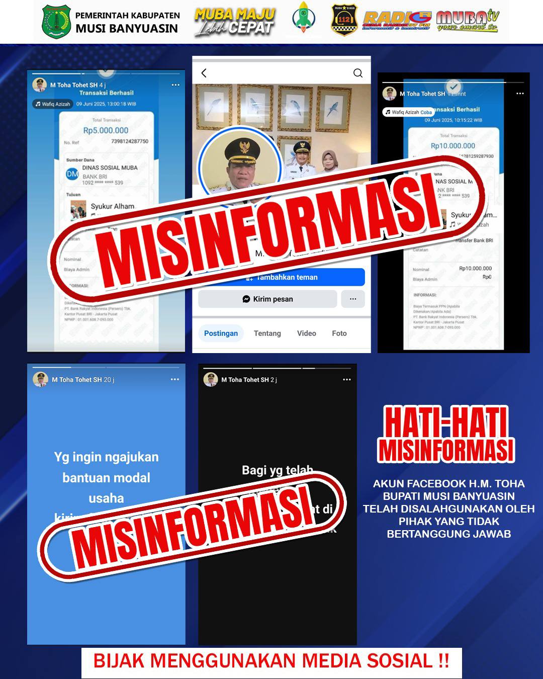 Sementara itu Plh Kepala Dinas Sosial Muba, Yuliarto, juga menambahkan, “Informasi yang beredar di akun Facebook palsu yang mengatasnamakan Bupati Muba itu tidak benar alias berita bohong dan mengenai penyaluran bantuan sosial PKM melalui M-Banking adalah tidak benar. Saat ini, proses penyaluran masih menunggu APBD Perubahan, dan nama-nama penerima manfaat sedang diinput ke dalam sistem. Mohon masyarakat tidak terpengaruh oleh berita yang menyesatkan ini.” Tegasnya. (*)