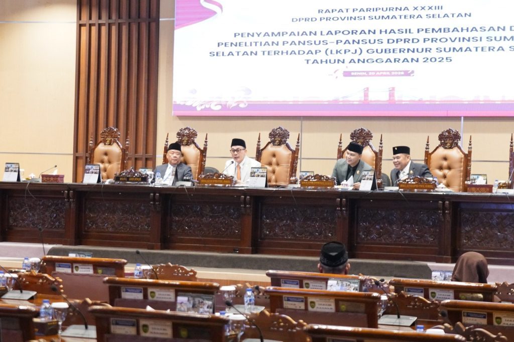 PALEMBANG — DPRD Provinsi Sumatera Selatan menggelar Rapat Paripurna XXXIII dengan agenda penyampaian laporan hasil pembahasan lima Panitia Khusus (Pansus) terhadap Laporan Keterangan Pertanggungjawaban (LKPJ) Gubernur Sumsel Tahun Anggaran 2025, Senin (20/4/2026).